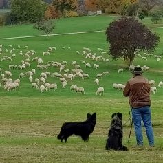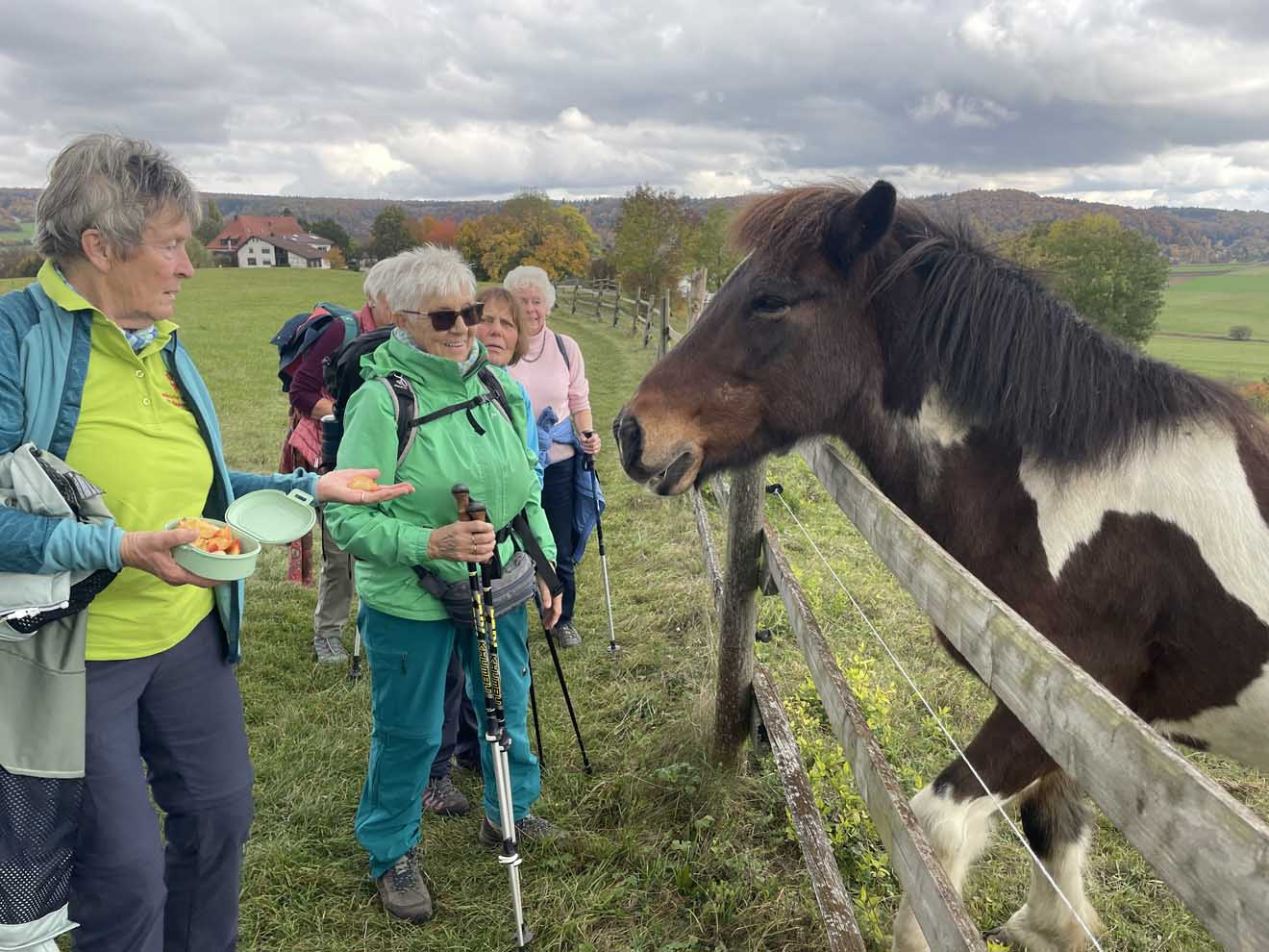 Durch das Ried ging es dann hinüber zum Klosterberg, dem Zentralhügel des Kraters, der durch die Auftürmung von Gesteinsschollen aus einer Tiefe von rund 380 m entstand, als der Meteorit damals einschlug. Hier erfreute eine Gruppe von Island-Pferden die Wanderinnen. Gerne wurden die letzten Apfelschnitze mit den zutraulichen Pferden geteilt. Ein Schäfer hatte seine Herde auf die Wiesen des Zentralhügels geführt und bot ein Bild der „Idylle pur“.