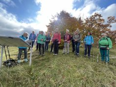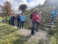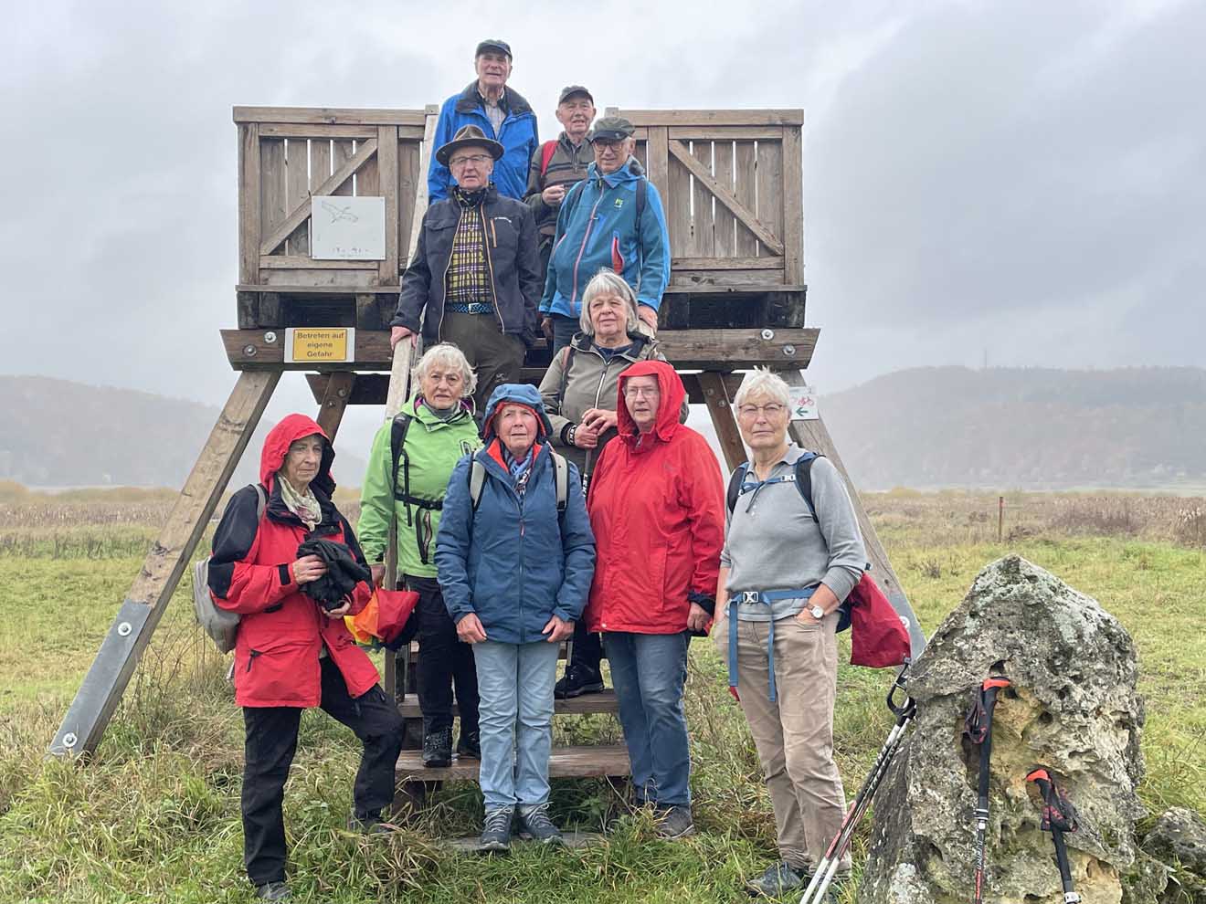 Es war ein richtiger Novembertag, der letzte Wandertag der Senioren mit Anton und Renate Rommel. Den ganzen Vormittag schüttete es ohne Pause, aber pünktlich zum Start legte der Regen eine Pause ein. 13 Wanderer und Wanderinnen zogen trockenen Fußes hinauf zum Schelklinger Berg. Da dies kein Albvereins-Wanderweg ist, war den meisten dieser Berg völlig unbekannt und daher interessant. Nach der Überquerung hatte man einen wunderschönen Blick über den Schmiechener See. Am großen Feldkreuz vorbei, erreichte man schließlich die Aussichtsplattform. Leider waren keine Wasservögel zu sehen und langsam fing es wieder an zu nieseln. Der See wurde dennoch umrundet und zum Schluss waren Regenjacken und Schirme völlig nass. So war dann jeder froh, als man nach 3 Stunden Wanderung in Schelklingen einkehrte und sich einen warmen Kaffee, Kuchen oder etwas Deftiges gönnen konnte.