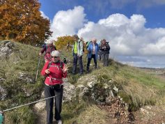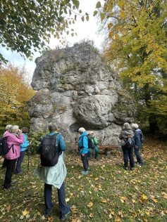 Mit Bahn und Bus ging‘s bei der letzten Frauenunternehmung nach Heidenheim und weiter nach Steinheim. Von dort wanderten die 13 Teilnehmerinnen hinauf zum Burgstall, einer ehemaligen mittelalterlichen Befestigung, und hatten einen grandiosen Blick auf das Steinheimer Becken und Sontheim. Die Burg lag auf dem Kraterrand, der aus geschichtetem Kalkstein besteht. Die Stoßwelle beim Einschlag des Meteoriten vor 15 Mio Jahren hat ihn in Schollen zerlegt und aus dem Inneren des Kraters an den Kraterrand geschoben. Weiter ging es auf dem „Hohen Beet“. Hier durchbrach einst der Wentalfluss den aus Trümmermassen bestehenden Rand des Steinheimer Beckens.